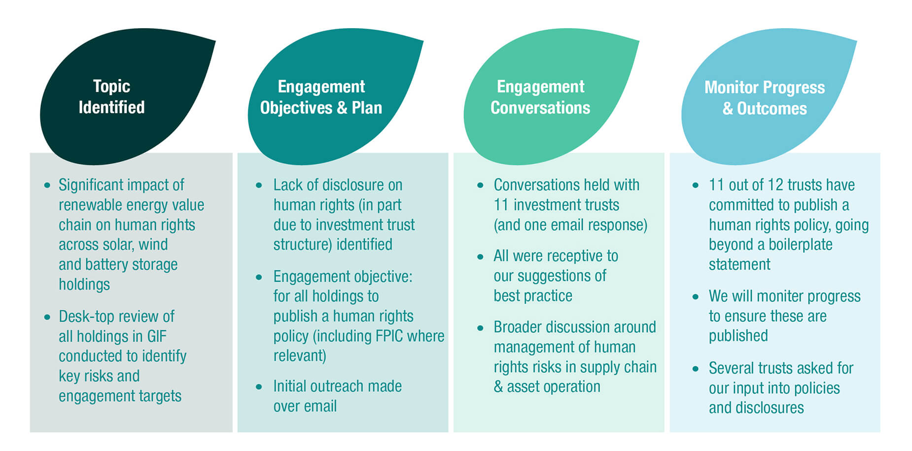 Against this backdrop, over the last six months we have been engaging with renewable energy investment trusts held in EdenTree’s Green Infrastructure Fund on the topic of human and labour rights. We targeted 12 companies in the fund’s universe, choosing to focus on investment trusts because of their potential adverse impacts on human rights and due to their unique corporate structure, which lends itself to less transparency in disclosures and investor scrutiny.